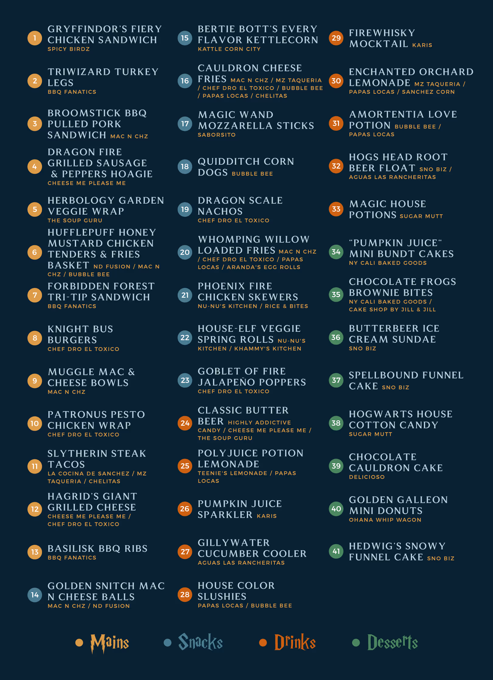 Cast a delicious spell with magical eats inspired by Hogwarts favorites like butterbeer floats, cauldron cakes, and pumpkin pasties. Expect house-themed treats and plenty of wizarding wonder.